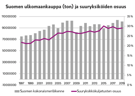 Tämä tarkoittaa sitä, että Suomen ulkomaankauppa keskittyy yhä harvempiin satamiin, ja yhä suurempivolyymisiin rautatie- ja maantiekuljetuksiin. Tämä luo yhä suurempia paineita Suomen logistiikan merkittävimmälle logistiikkakeskittymälle, Uudellemaalle.