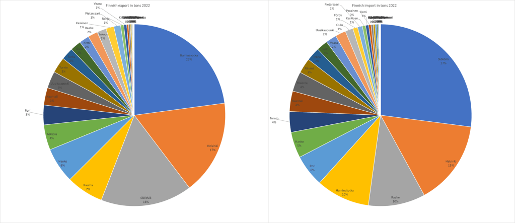 Jos tarkastellaan Suomen vienti- ja tuontimääriä tonneina satamittain nähdään, että seitsemän sataman kautta kulkee 45 prosenttia viennistä ja vastaavasti seitsemän sataman kautta kulkee 45 prosenttia tuonnista. Osa satamista on samoja, osa hieman eroaa.