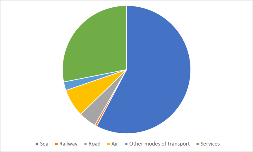 It is remarkable that only 80 percent of the value of goods exports goes by sea – the rest goes by air or road, for example. In other words, less than 60 percent of our exports are transported by sea (55-58% depending on the statistical source), the rest is service exports and other forms of transport. We also see that, for example, the share of the forest industry in our country’s export earnings is about ten percent.