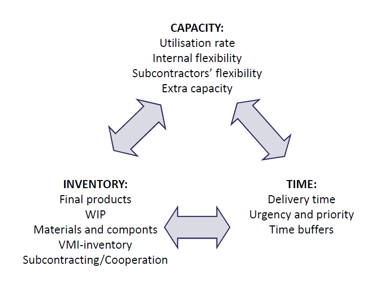 Security of supply can be ensured in many ways. Traditionally, delivery reliability has been increased with large warehouses. In addition, we can also reduce dependence by e.g. changing consumption habits, using more subcontractors, planning alternative products, predictability, moving the order point to the last possible moment and reducing wastage. Other tools for managing supply chains are capacity flexibility, scheduling changes and time buffers, and speeding up the flow of information from demand to production.