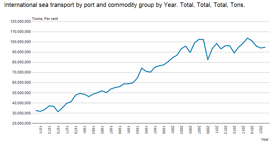 In 2022, Finland’s foreign trade by sea was 95 million tons. The amount varies every year, but in practice over the past 20 years foreign trade by sea has remained at the same level.