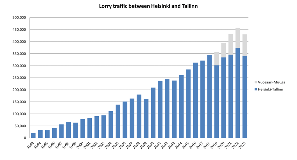 Figure 6. Truck traffic between Helsinki and Tallinn 1993-2023. There was already ro-ro traffic from Vuosaari to Muuga in Estonia starting in 2015, but Traficom’s statistics did not separate them until 2019. Source: Traficom and its predecessors.