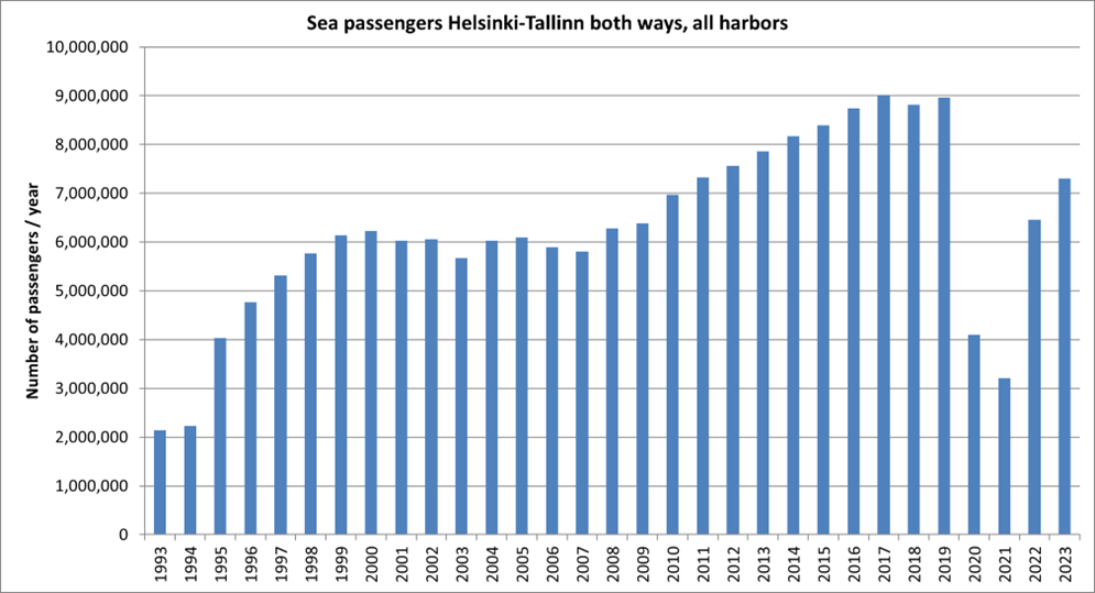 Figure 7. Passenger traffic between Helsinki and Tallinn 1993-2023 (Source: Traficom and its predecessors)