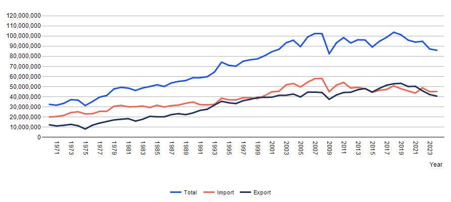 Figure 2. Development of Finland’s seaborne foreign trade 1970-2024 (tonnes). Source: Statistics Finland