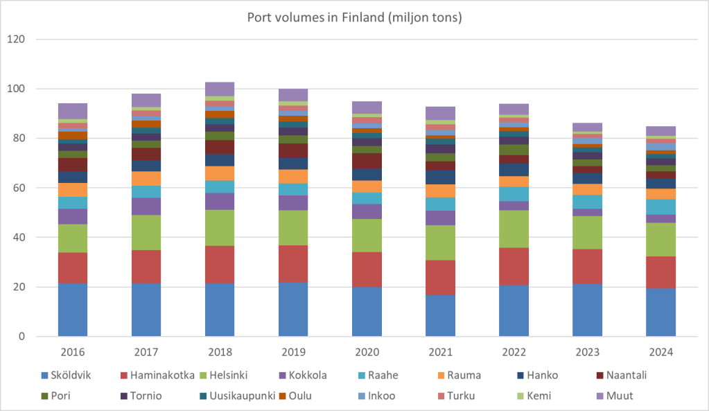 The volume of goods passing through Finnish ports has not increased recently. In 2024, the total volume of sea transport was 85 million tonnes. The last time it was at this low a level was in 2009. According to statistics, 15 ports handle over 95 percent of Finnish maritime traffic, and less than 5 percent of traffic passes through other ports.