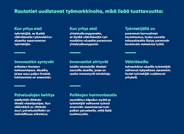 Historia kertoo meille, että mitä suurempi kaupunki, sitä suuremmaksi sen tuottavuus on työnjaon, suurempien resurssien ja erikoistumisen avulla kasvanut. Isot liikennehankkeet, jotka yhdistävät kaupunkeja, mahdollistavat juuri tällaista pitkäaikaista taloudellista kasvua (ks. kuva alla).